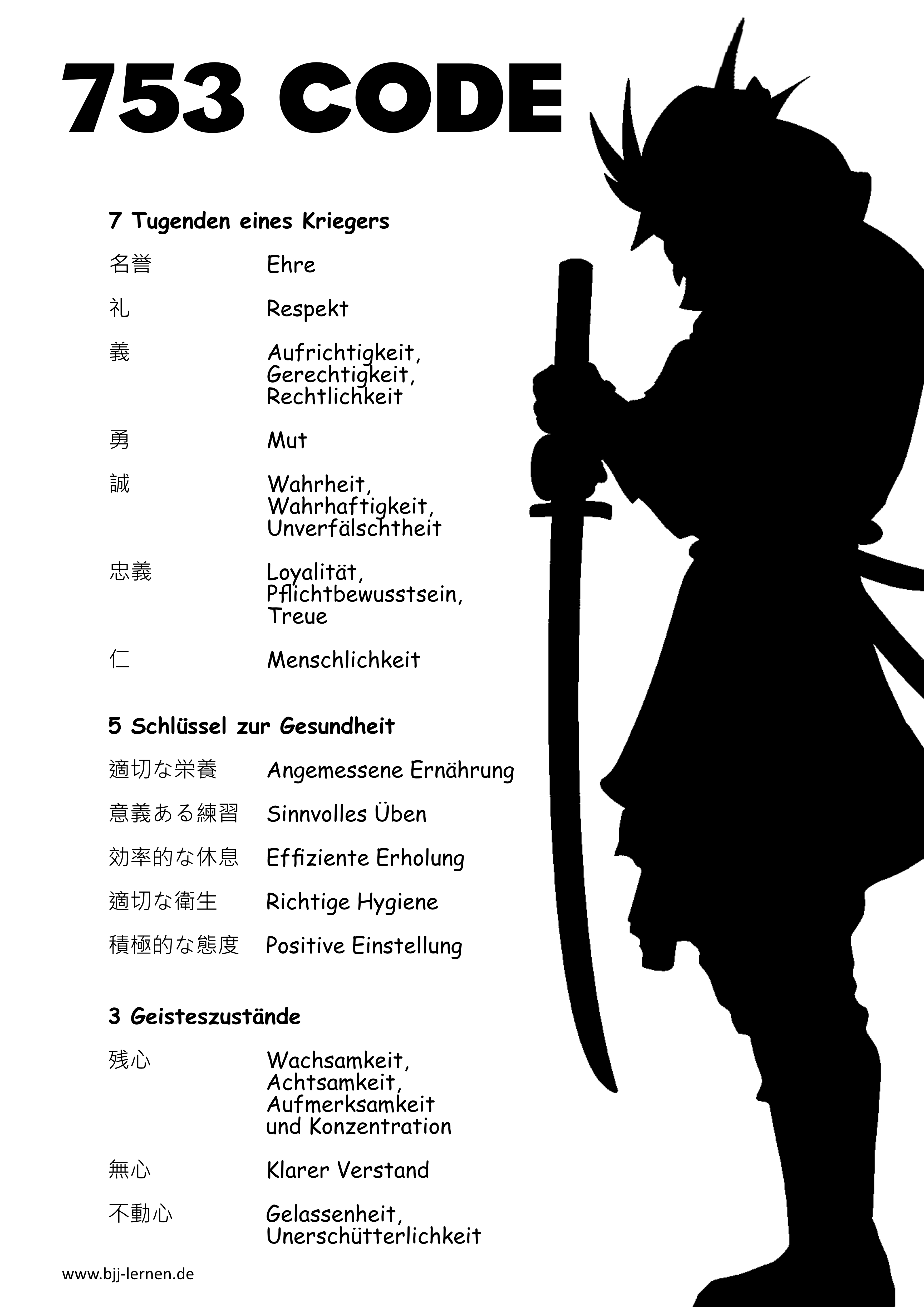 Der 753 Code beinhaltet die 7 Tugenden eines Kriegers, 5 Schlüssel zur Gesundheit und 3 Geisteszustände möchten wir euch hier etwas näher erklären. Diese können uns im Training und im Alltag helfen uns stätig zu Verbessern.